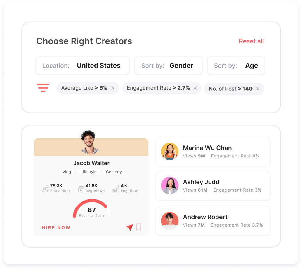 Looking for creators from specific categories, countries or demographic? Our advanced search filters allow you to run searches based on many different criteria such as influencer’s location, audience location, category, average views, average comments, average likes, engagement rate, audience gender, number of posts etc. That means, you can find the right influencers to promote your brands and business. Hiring the perfect influencers will give you the best ROI, and Racontor will help you achieve that.